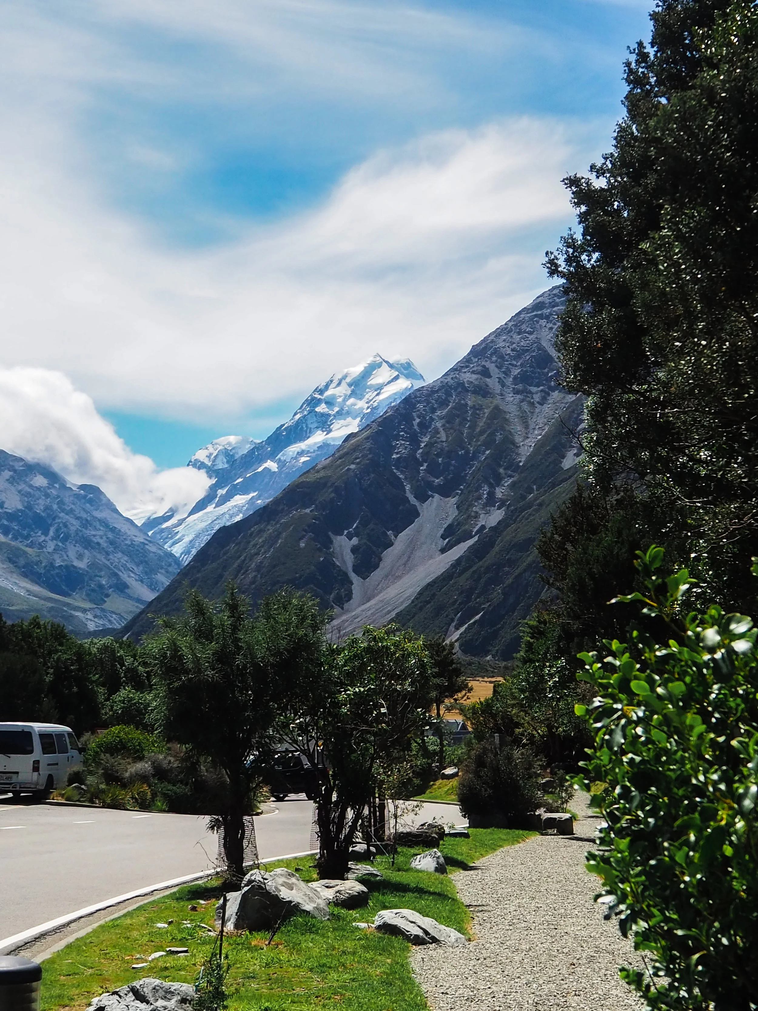A New Zealand road trip stop was Mt. Cook on the South Island. It was a beautiful summer day and the skies were very clear, leading to a nice, clear, view of the peak. We were even able to see the mountain from quite far away when driving towards it. After having been there, we were told that we had been very lucky as the mountain is almost always hidden behind clouds and fog.